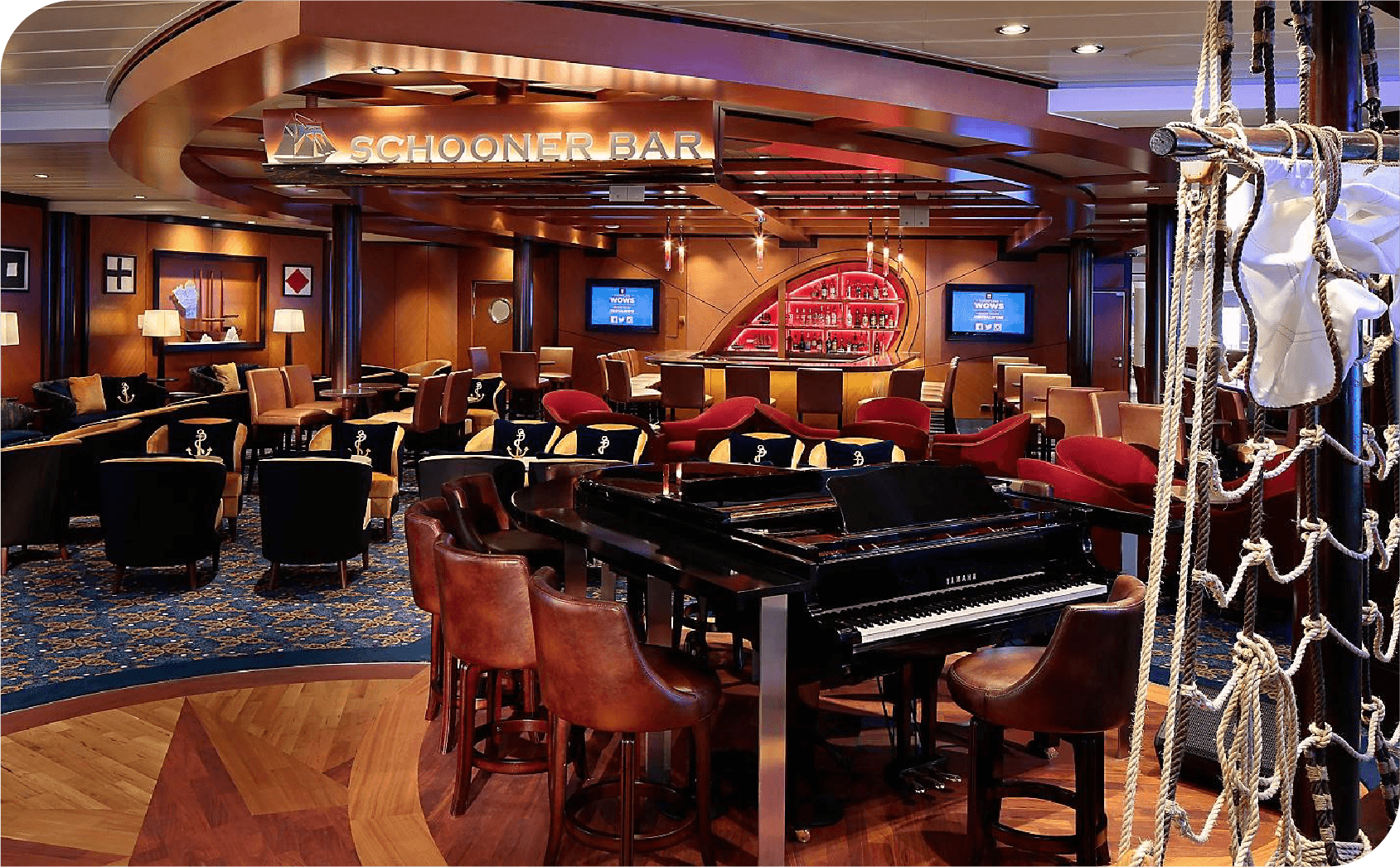 走進 Schooner 酒吧,溫暖的木質調與航海元素讓人彷彿置身經典帆船之中。這裡的招牌雞尾酒由專業調酒師精心打造,酒香在海風中更顯迷人。找個喜歡的位置——桅杆下的陰影裡、舷窗旁的海景座位,或是閃耀的大鋼琴邊——隨著音樂響起,現場娛樂表演與觀眾的笑聲交織,甚至可以和歌手一起高歌,把今晚變成你的海上回憶。
